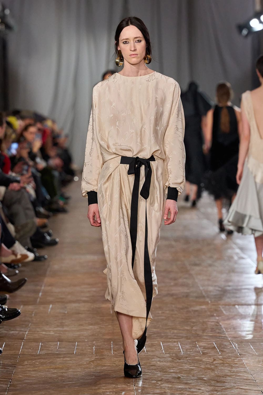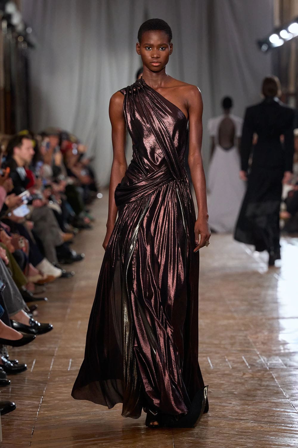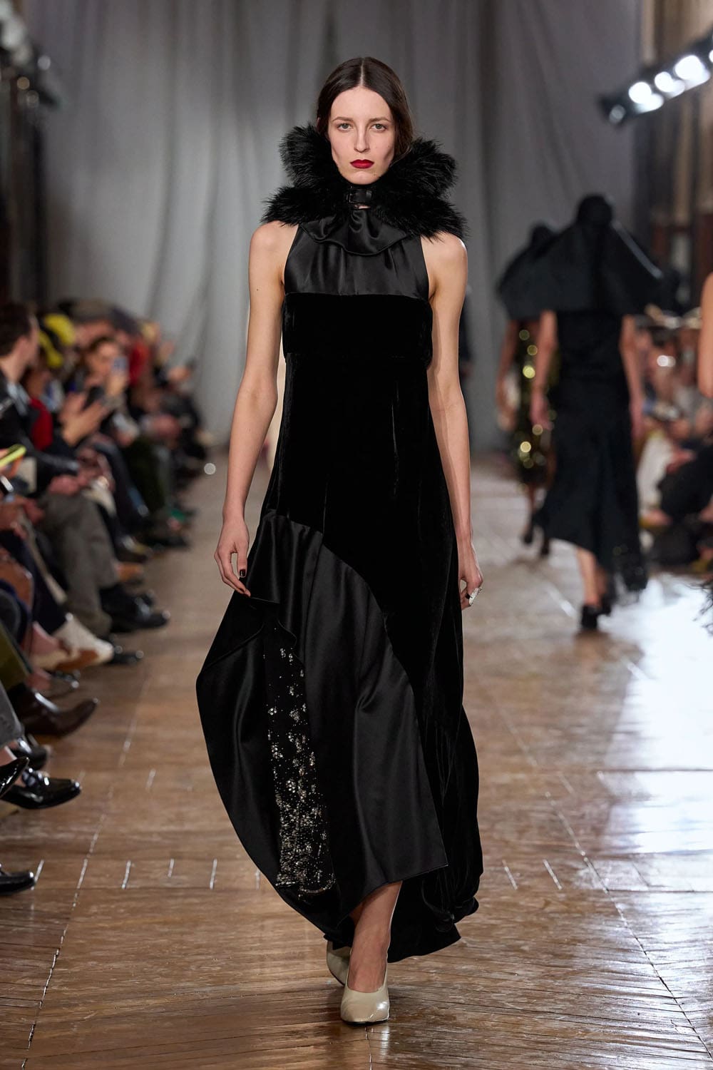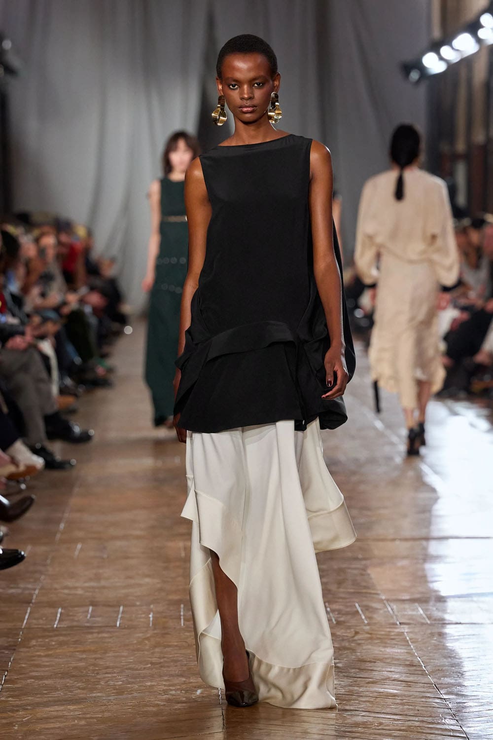 De la confection sur mesure, les silhouettes s'épanouissaient en formes plus amples : robes au volume maîtrisé, manteaux au drapé architectural, vêtements qui occupaient l'espace sans l'envahir. Une robe couleur crème, à la jupe ample et vaporeuse comme une lanterne, semblait flotter, sa construction aussi légère qu'un souffle, mais d'une précision mathématique. Une robe en velours noir, froncée à la hanche en un drapé en spirale, évoquait le glamour des soirées des années 1920, revisité par le modernisme épuré de Copping.