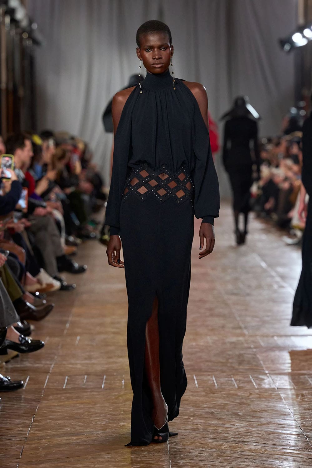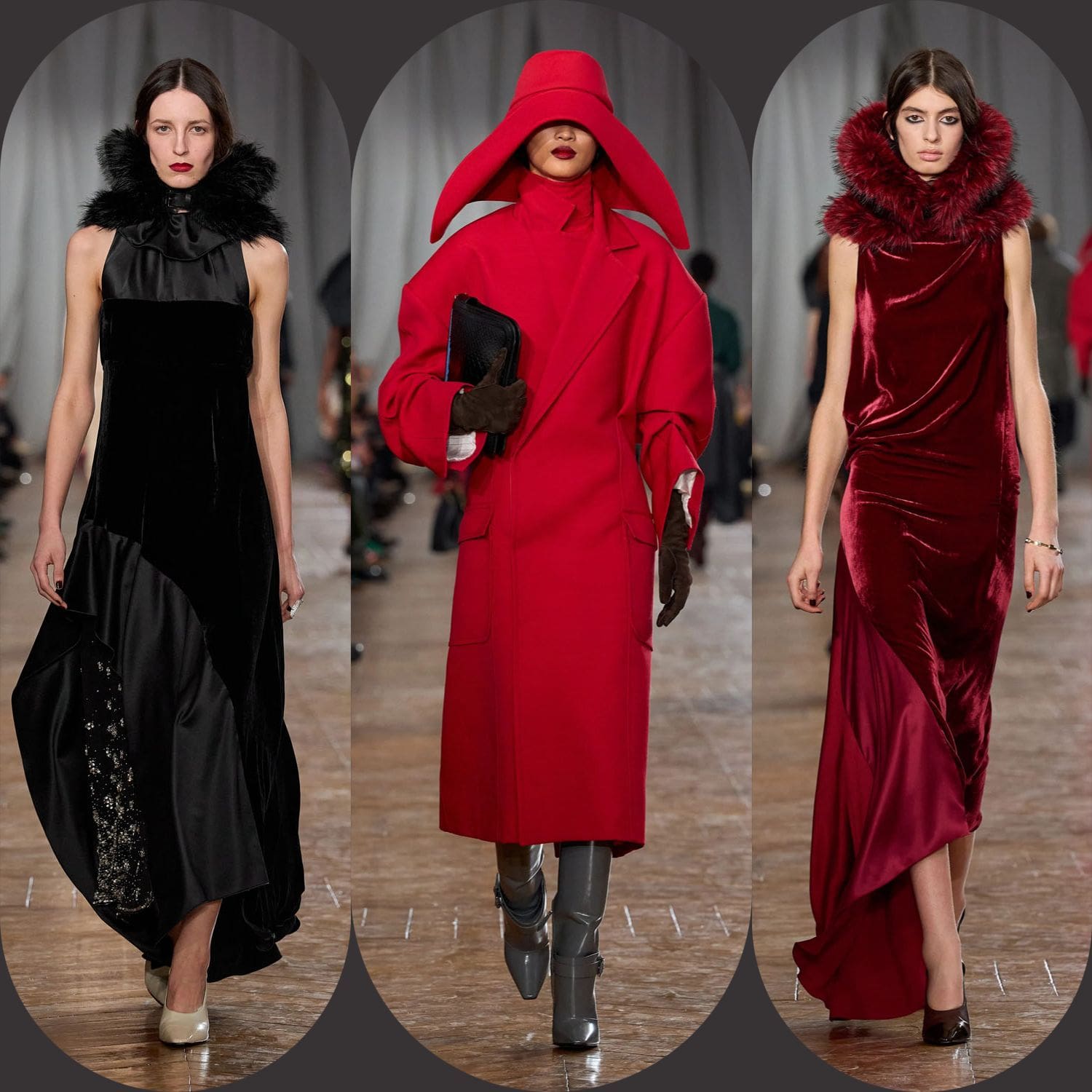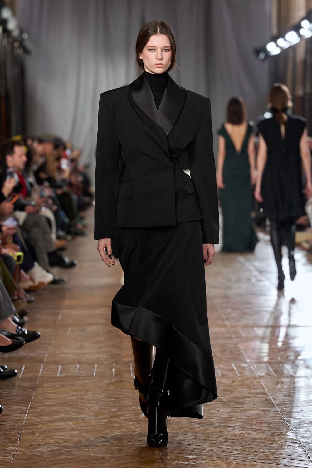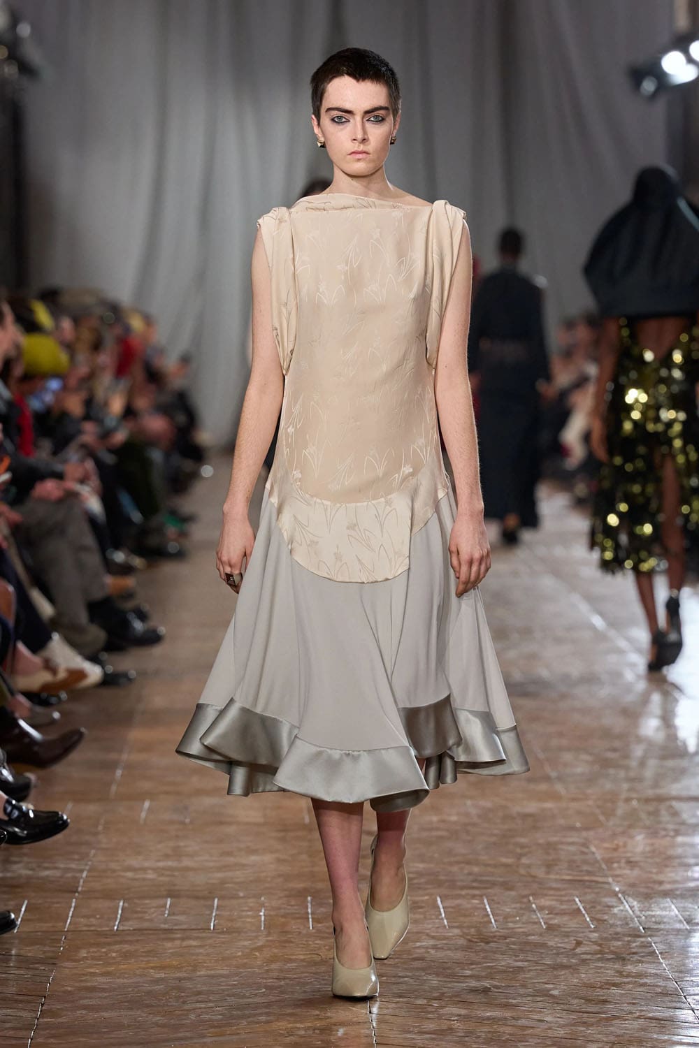 De la confection sur mesure, les silhouettes s'épanouissaient en formes plus amples : robes au volume maîtrisé, manteaux au drapé architectural, vêtements qui occupaient l'espace sans l'envahir. Une robe couleur crème, à la jupe ample et vaporeuse comme une lanterne, semblait flotter, sa construction aussi légère qu'un souffle, mais d'une précision mathématique. Une robe en velours noir, froncée à la hanche en un drapé en spirale, évoquait le glamour des soirées des années 1920, revisité par le modernisme épuré de Copping.