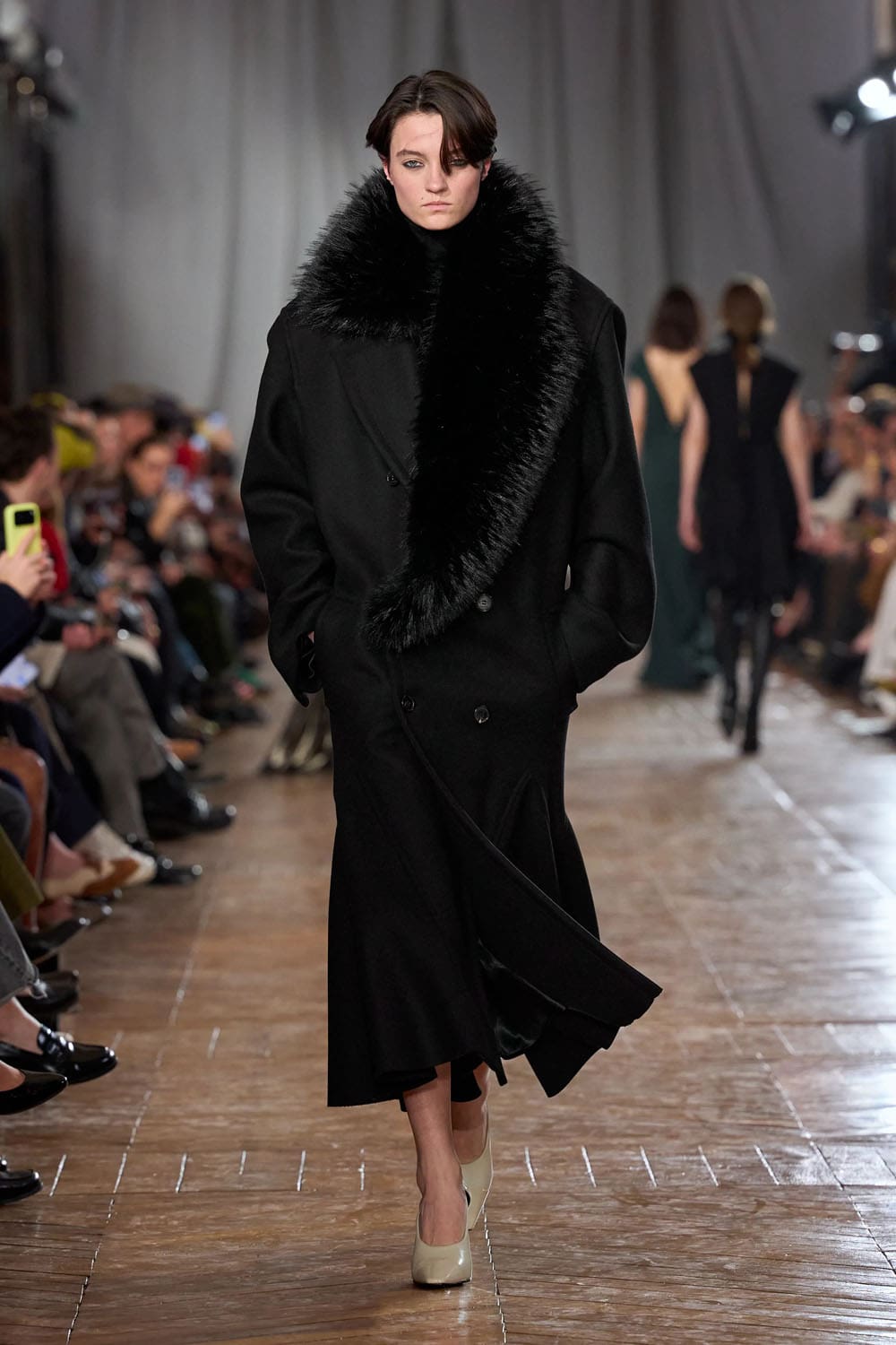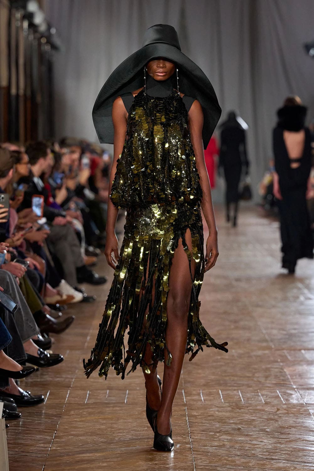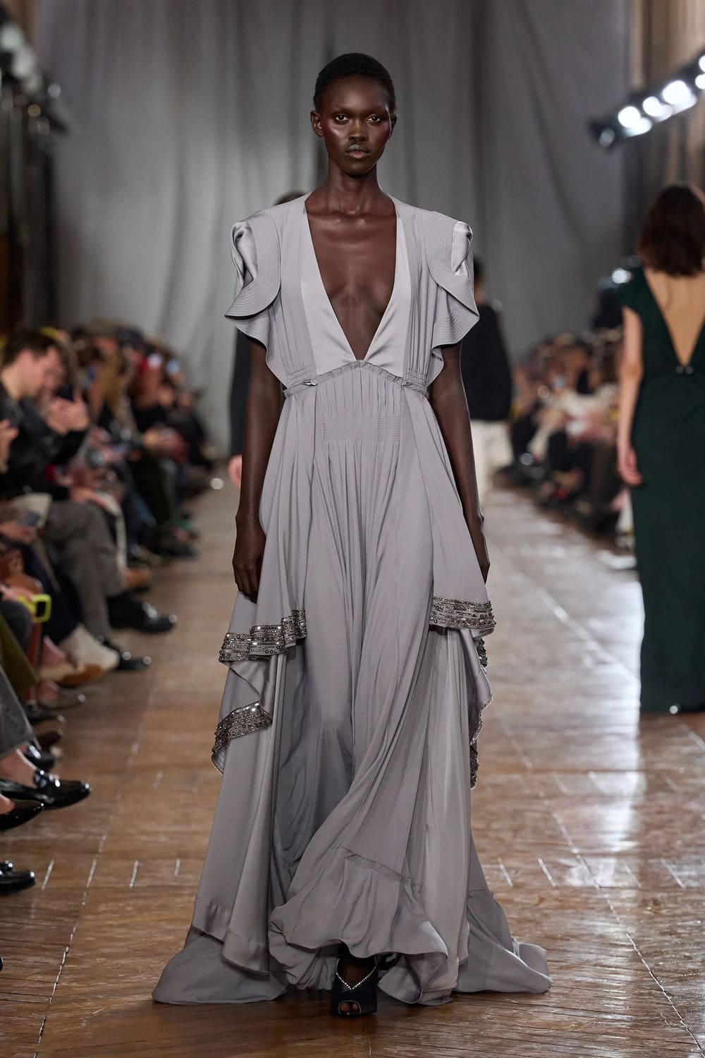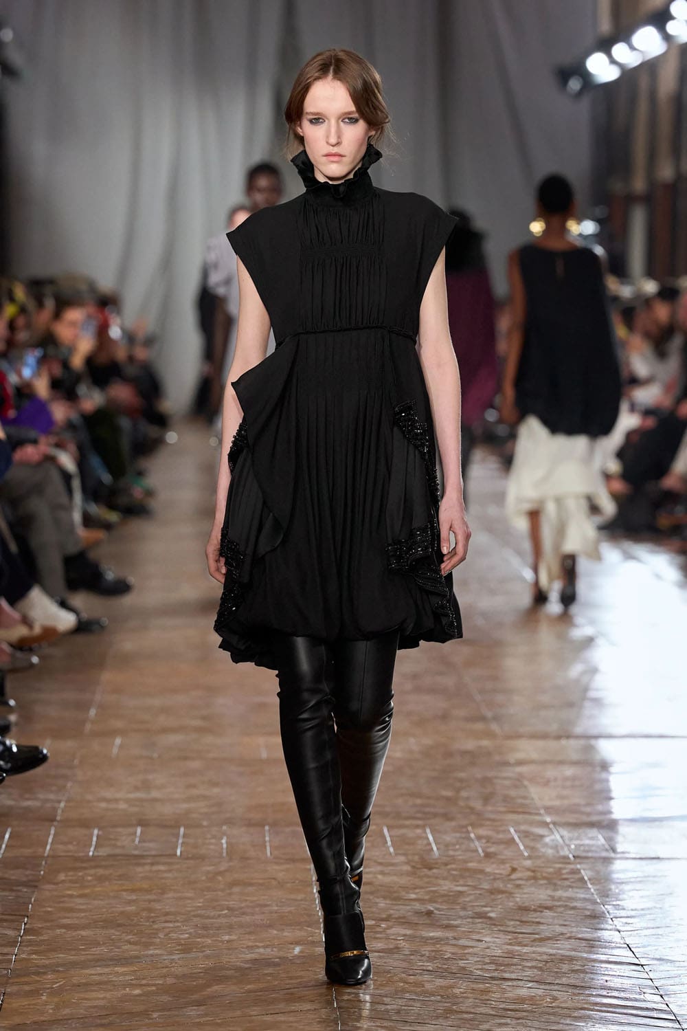 De la confection sur mesure, les silhouettes s'épanouissaient en formes plus amples : robes au volume maîtrisé, manteaux au drapé architectural, vêtements qui occupaient l'espace sans l'envahir. Une robe couleur crème, à la jupe ample et vaporeuse comme une lanterne, semblait flotter, sa construction aussi légère qu'un souffle, mais d'une précision mathématique. Une robe en velours noir, froncée à la hanche en un drapé en spirale, évoquait le glamour des soirées des années 1920, revisité par le modernisme épuré de Copping.