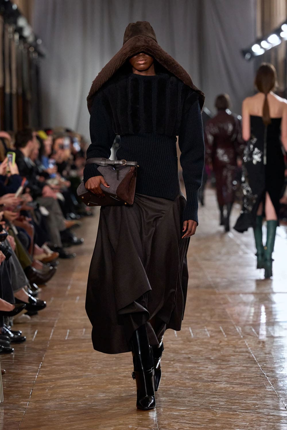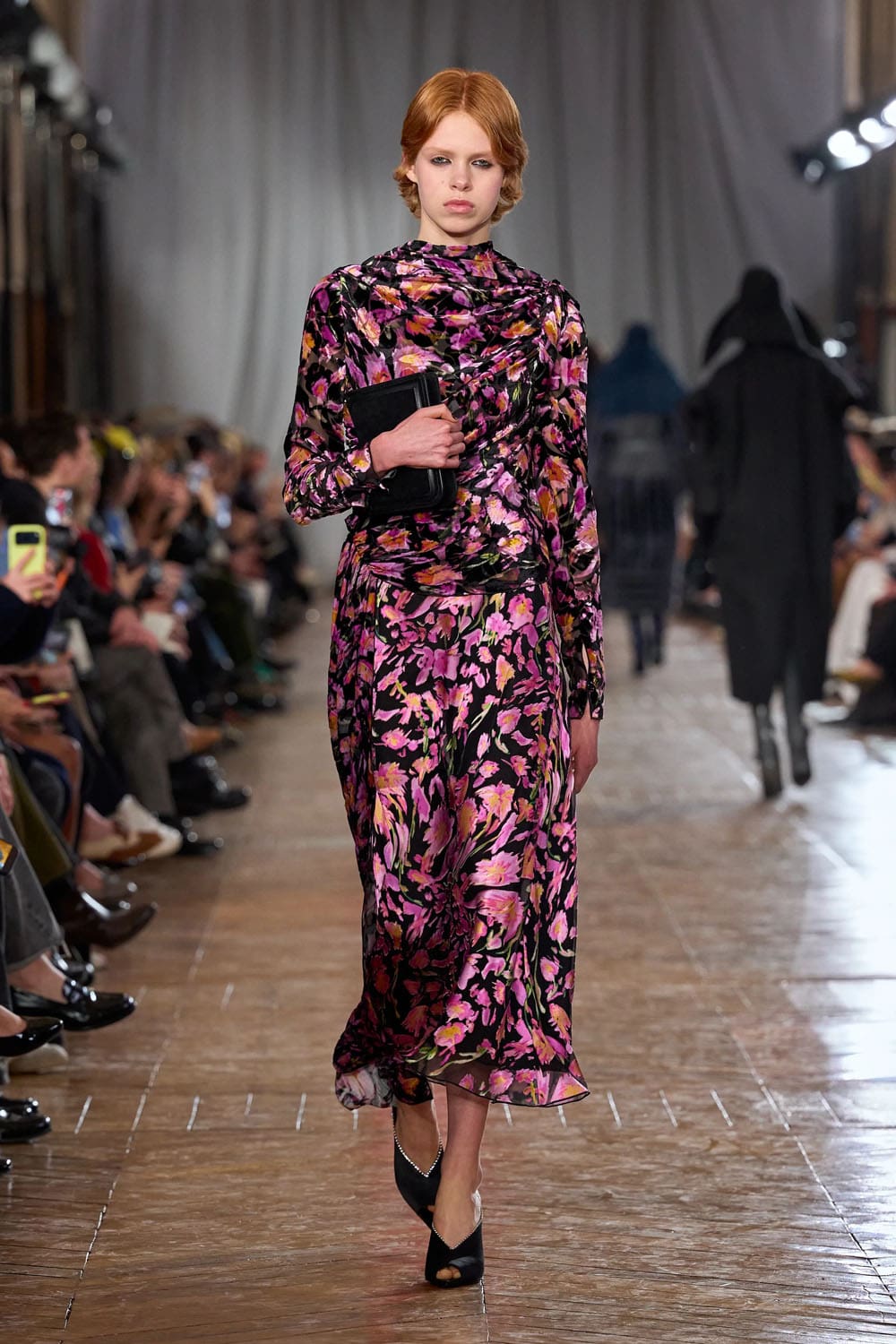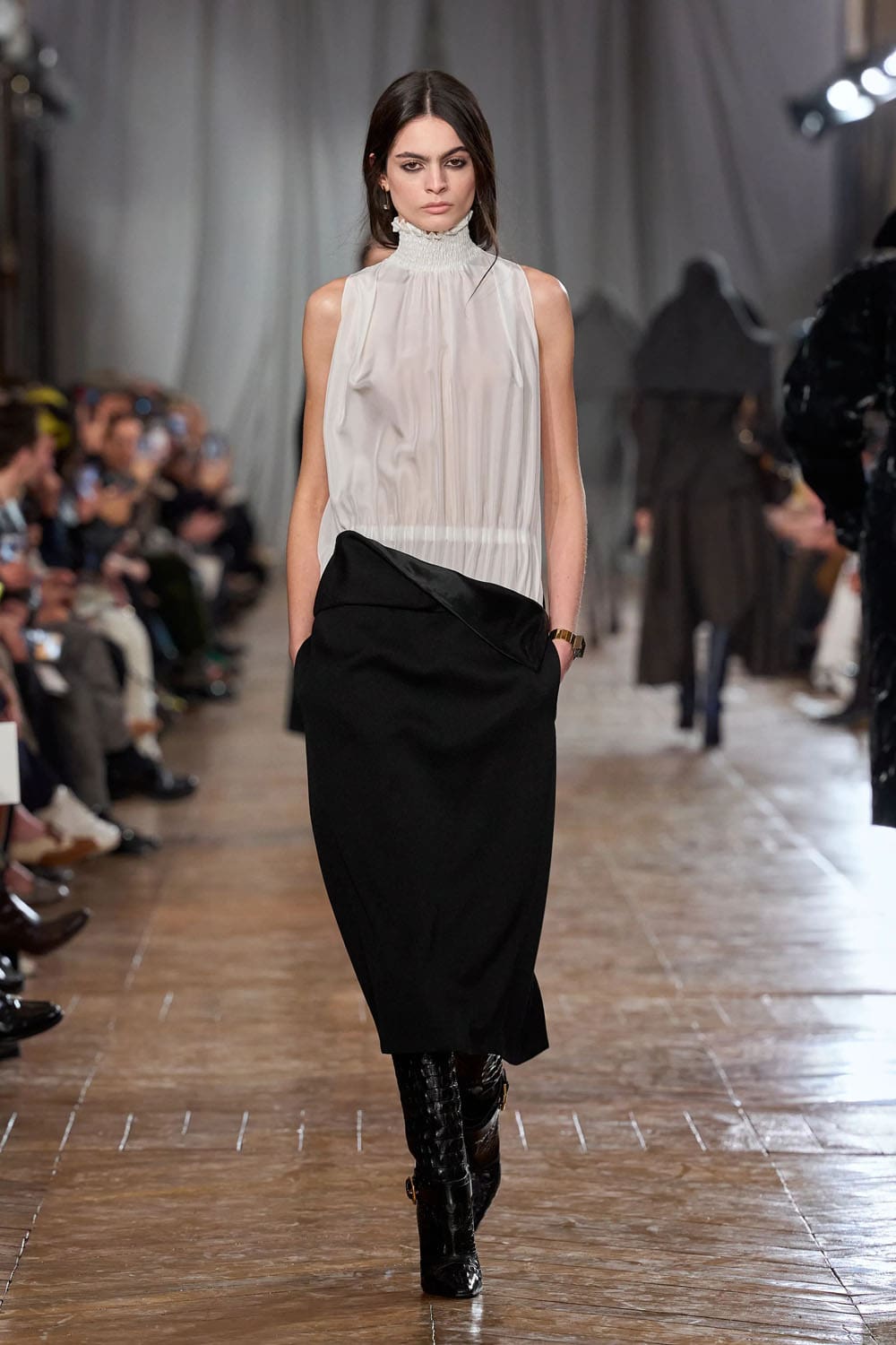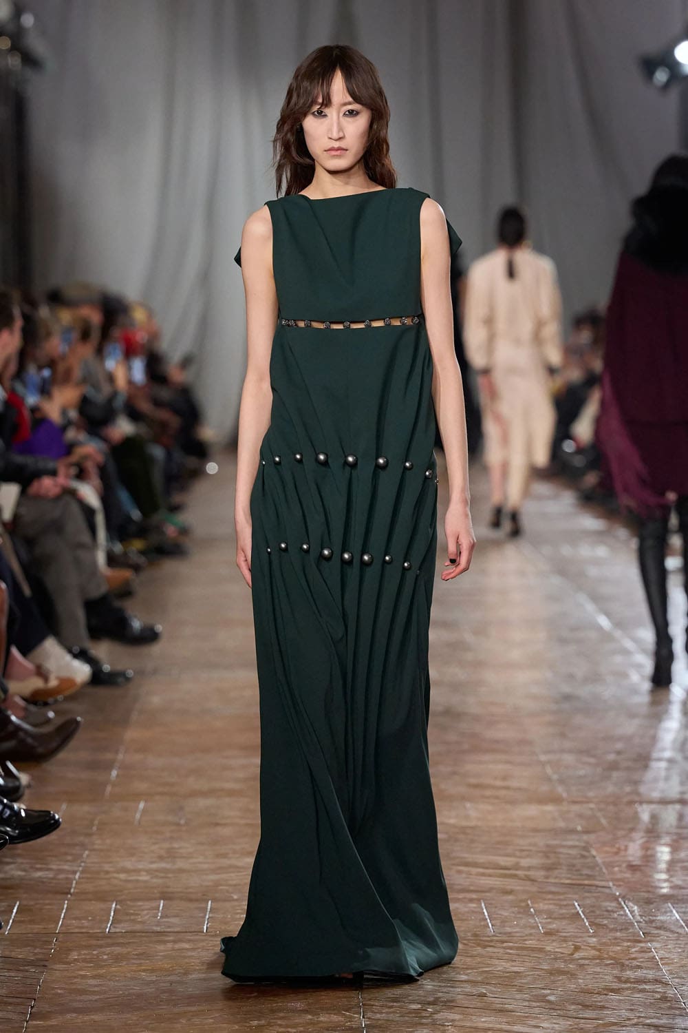De la confection sur mesure, les silhouettes s'épanouissaient en formes plus amples : robes au volume maîtrisé, manteaux au drapé architectural, vêtements qui occupaient l'espace sans l'envahir. Une robe couleur crème, à la jupe ample et vaporeuse comme une lanterne, semblait flotter, sa construction aussi légère qu'un souffle, mais d'une précision mathématique. Une robe en velours noir, froncée à la hanche en un drapé en spirale, évoquait le glamour des soirées des années 1920, revisité par le modernisme épuré de Copping.