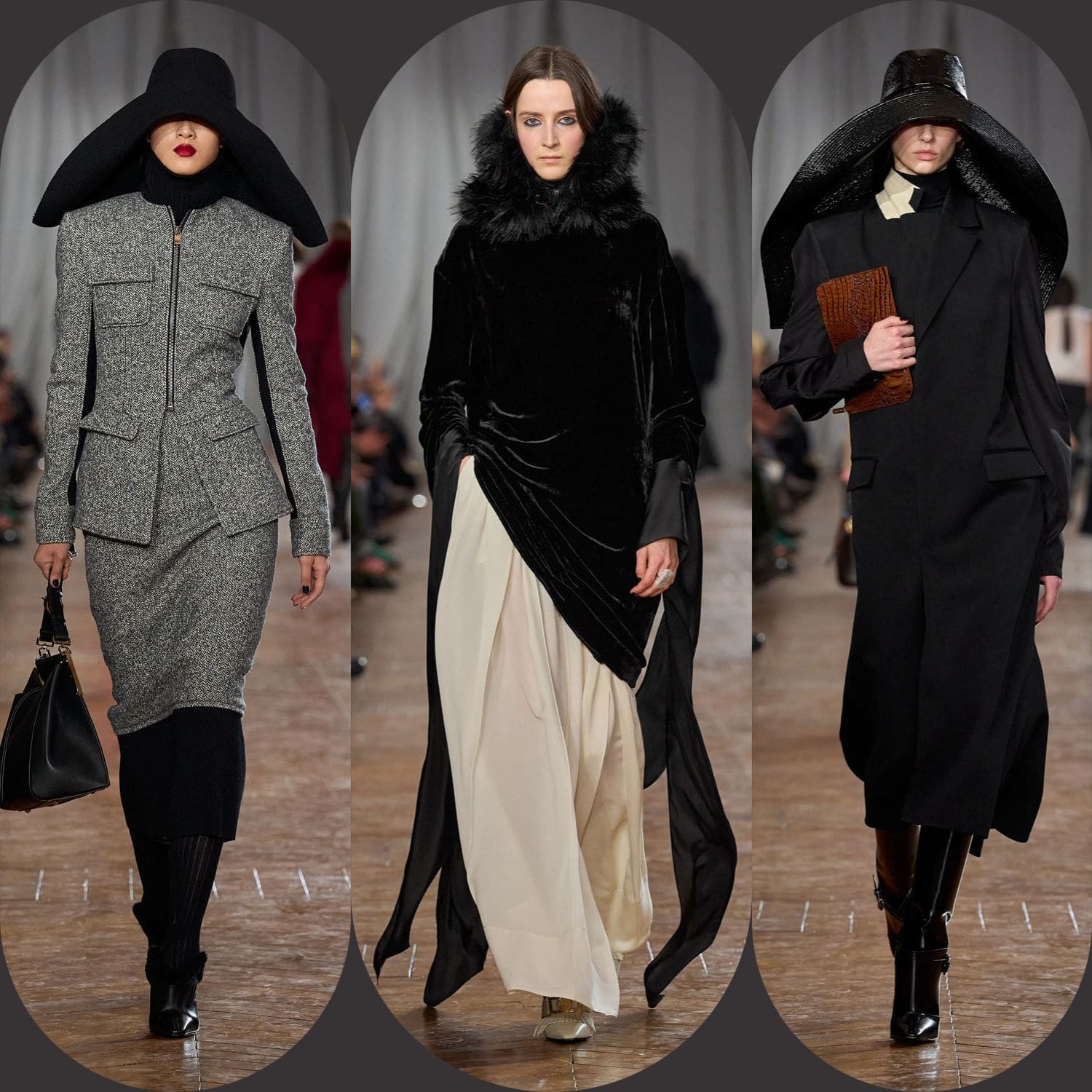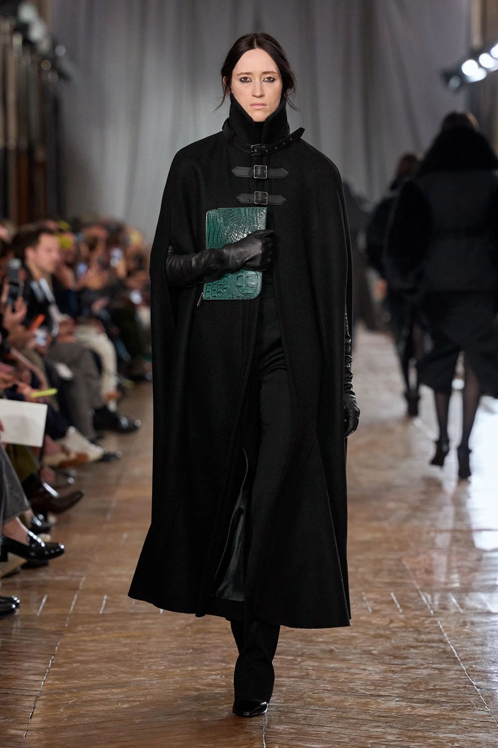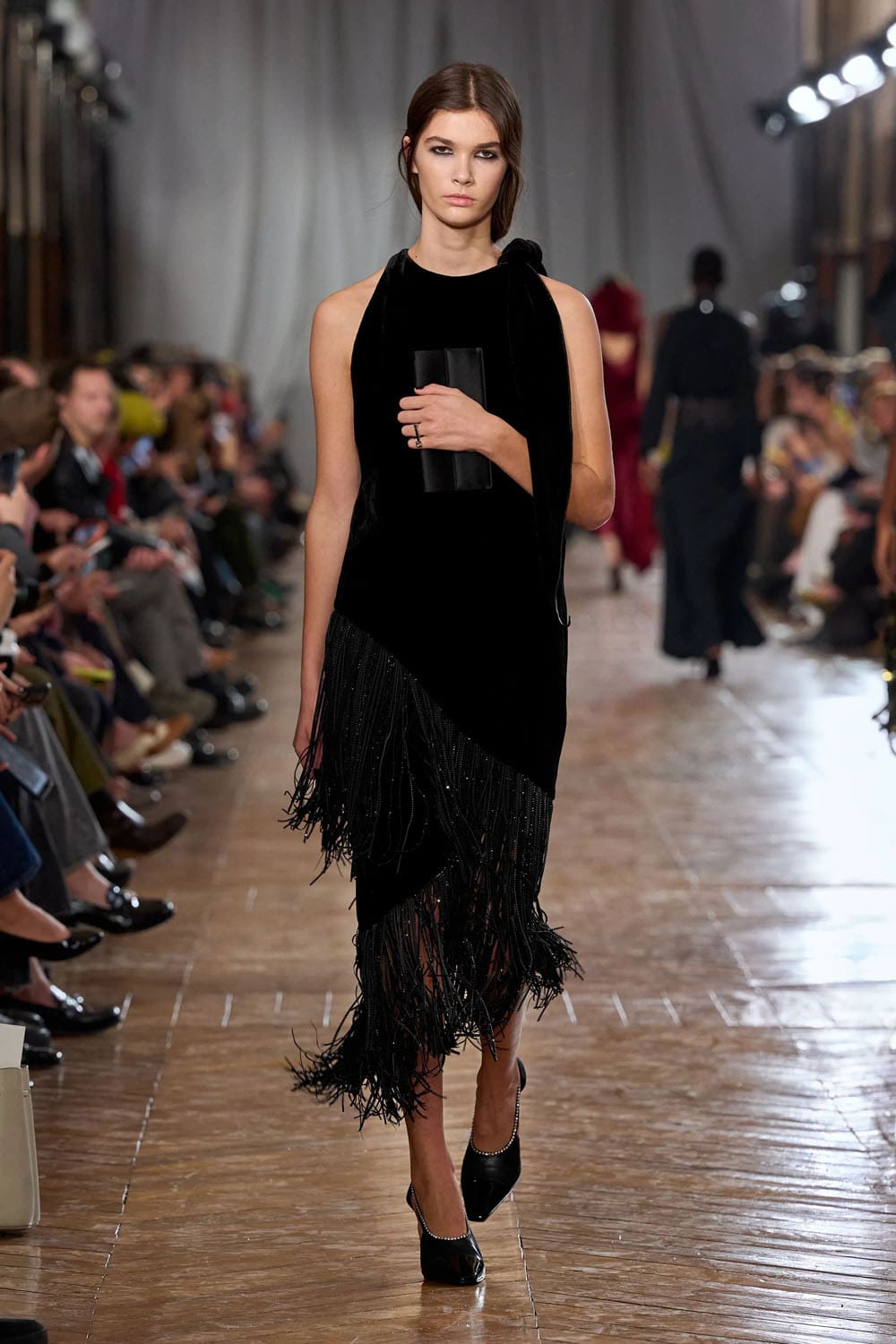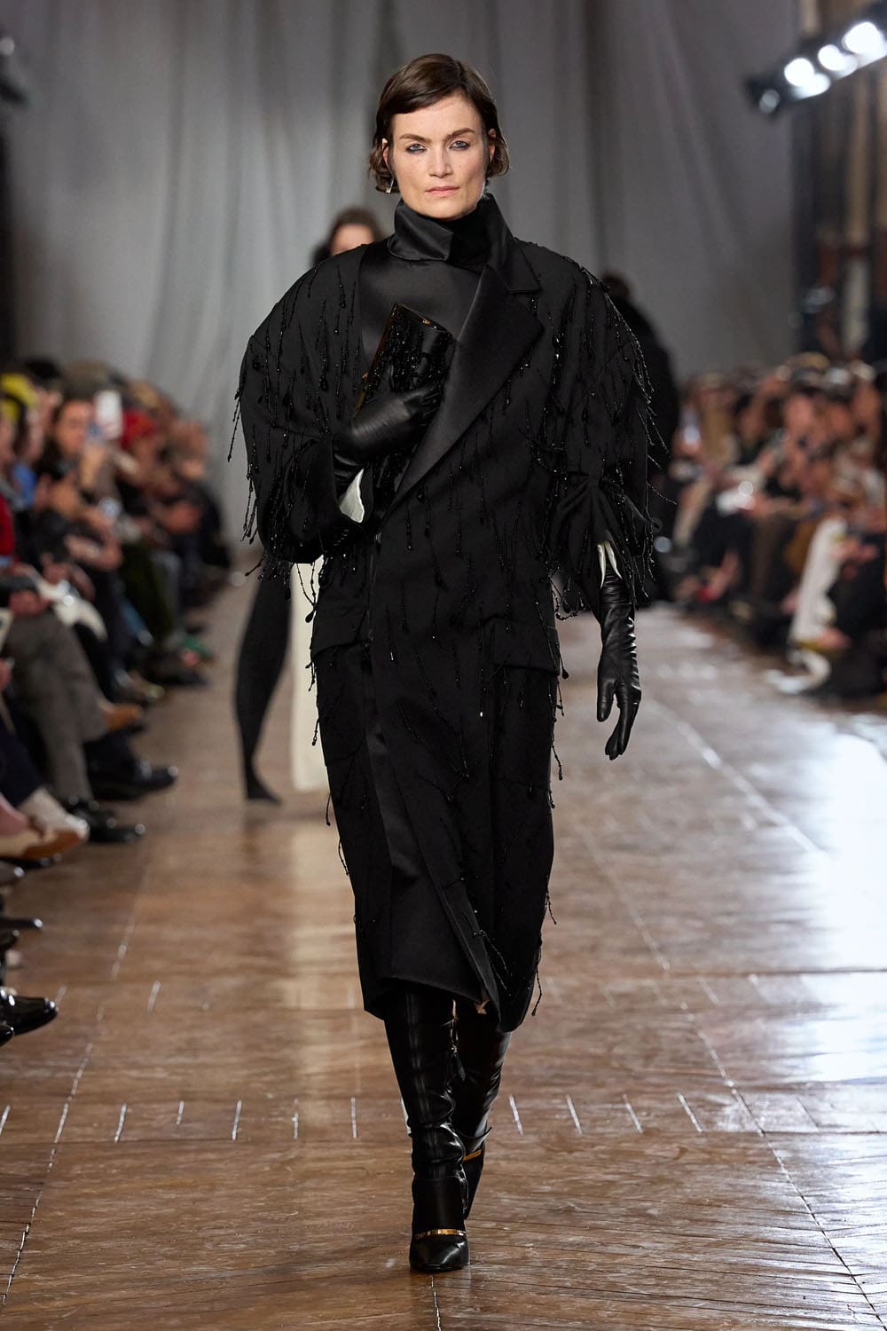 Les accessoires reprenaient les codes des années 1920 sans tomber dans le pastiche. Les gants, d'une austérité presque séduisante, s'étendaient au-delà du poignet. Les sacs arboraient des formes angulaires et géométriques, évoquant les intérieurs Art déco. Les chaussures alternaient entre escarpins sculptés et bottines fines qui allongeaient la jambe sans dénaturer les proportions des vêtements.