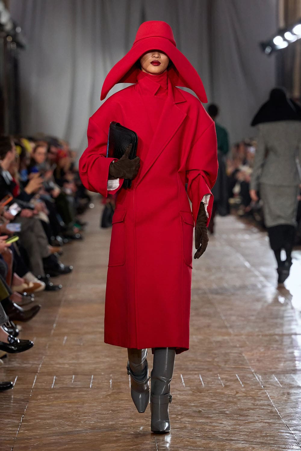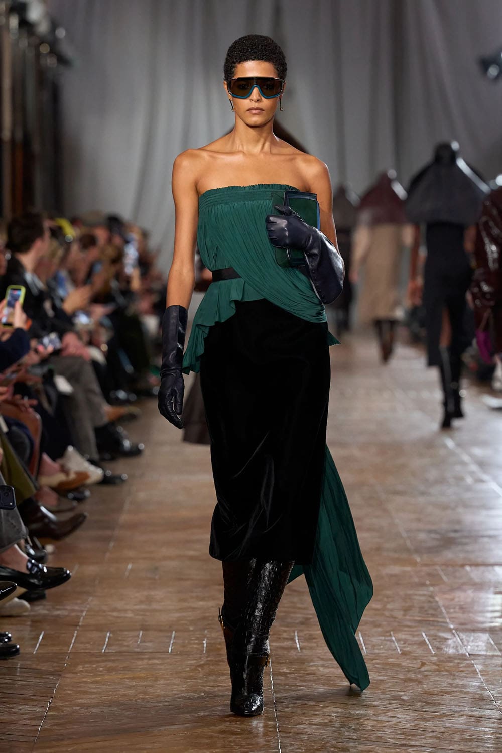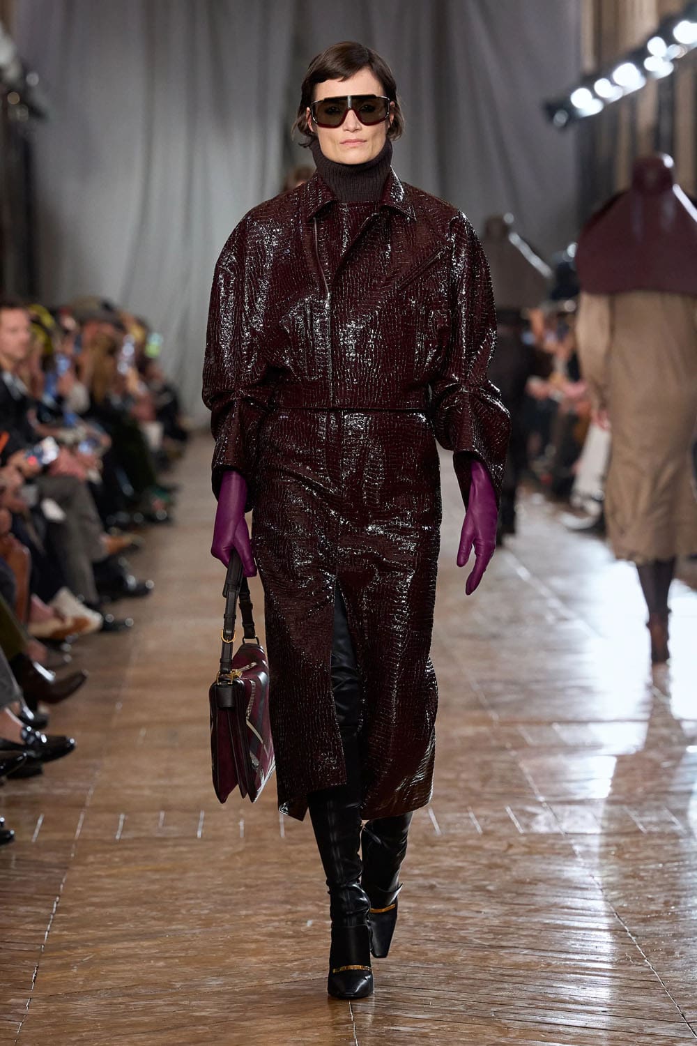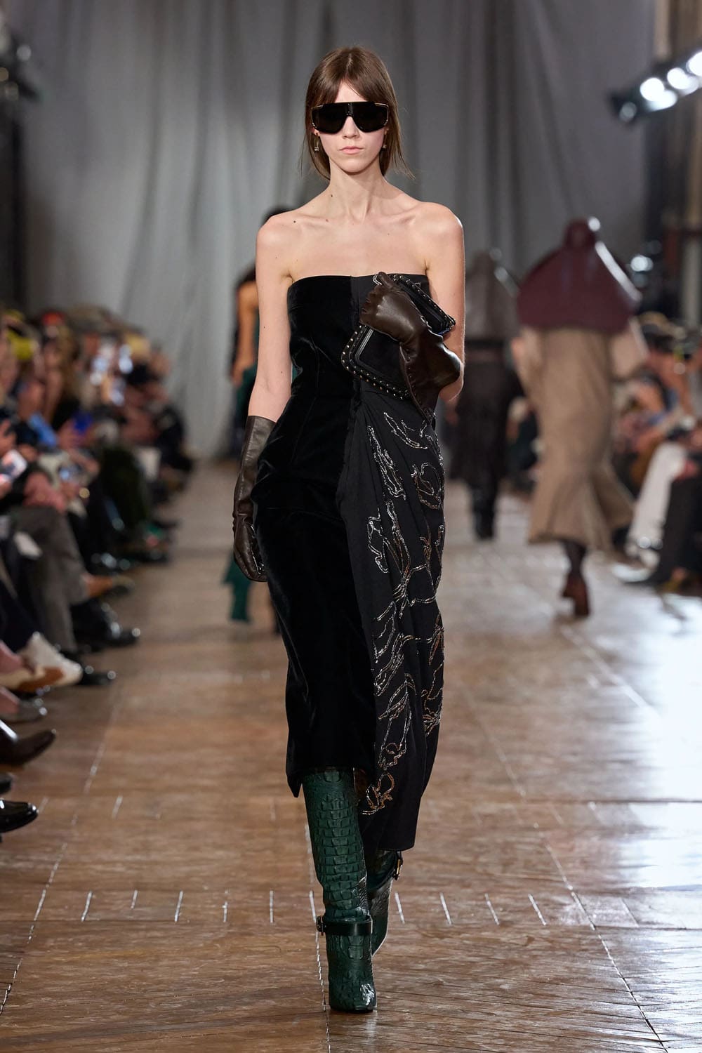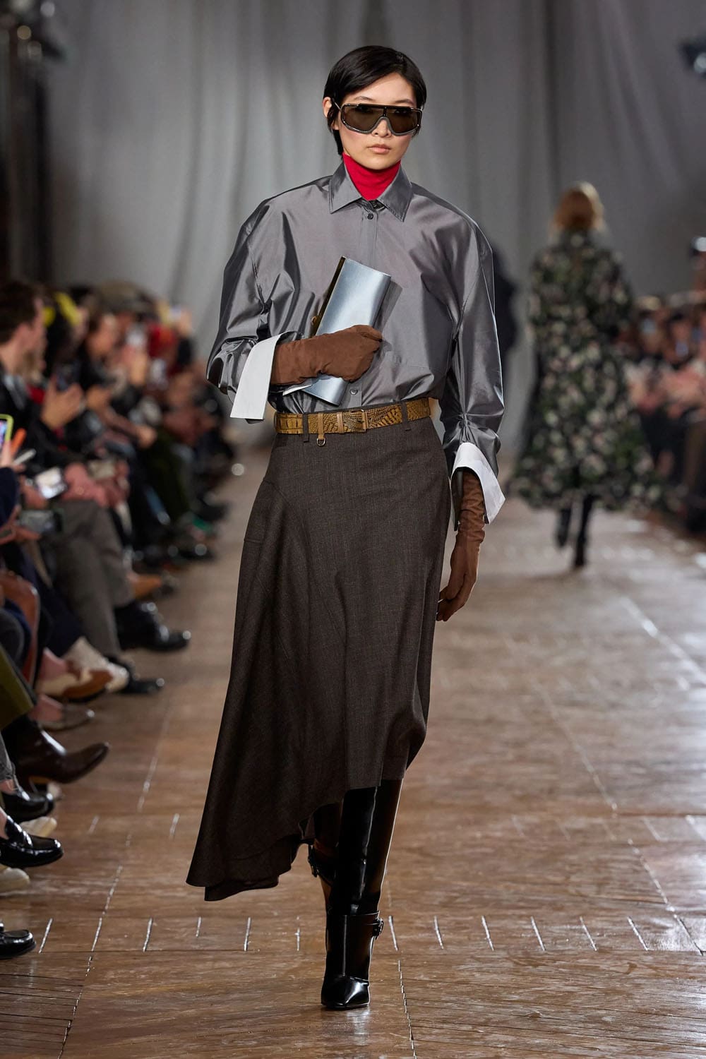 Les accessoires reprenaient les codes des années 1920 sans tomber dans le pastiche. Les gants, d'une austérité presque séduisante, s'étendaient au-delà du poignet. Les sacs arboraient des formes angulaires et géométriques, évoquant les intérieurs Art déco. Les chaussures alternaient entre escarpins sculptés et bottines fines qui allongeaient la jambe sans dénaturer les proportions des vêtements.