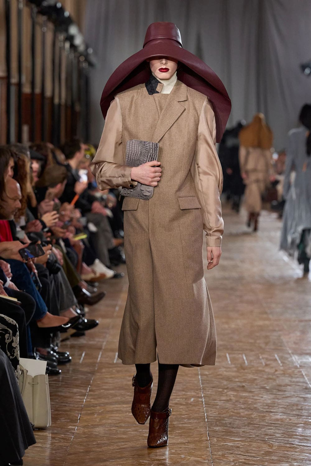 Les vêtements d'extérieur ancraient la collection dans la réalité. Un manteau en laine grenat profond, courbé vers l'avant comme une carapace protectrice, faisait écho à l'environnement minéral du lieu. Un autre, en gabardine ivoire, arborait un col sculptural et précis, dressé comme en dialogue avec les vitrines de cristaux géologiques qui se trouvaient derrière lui.