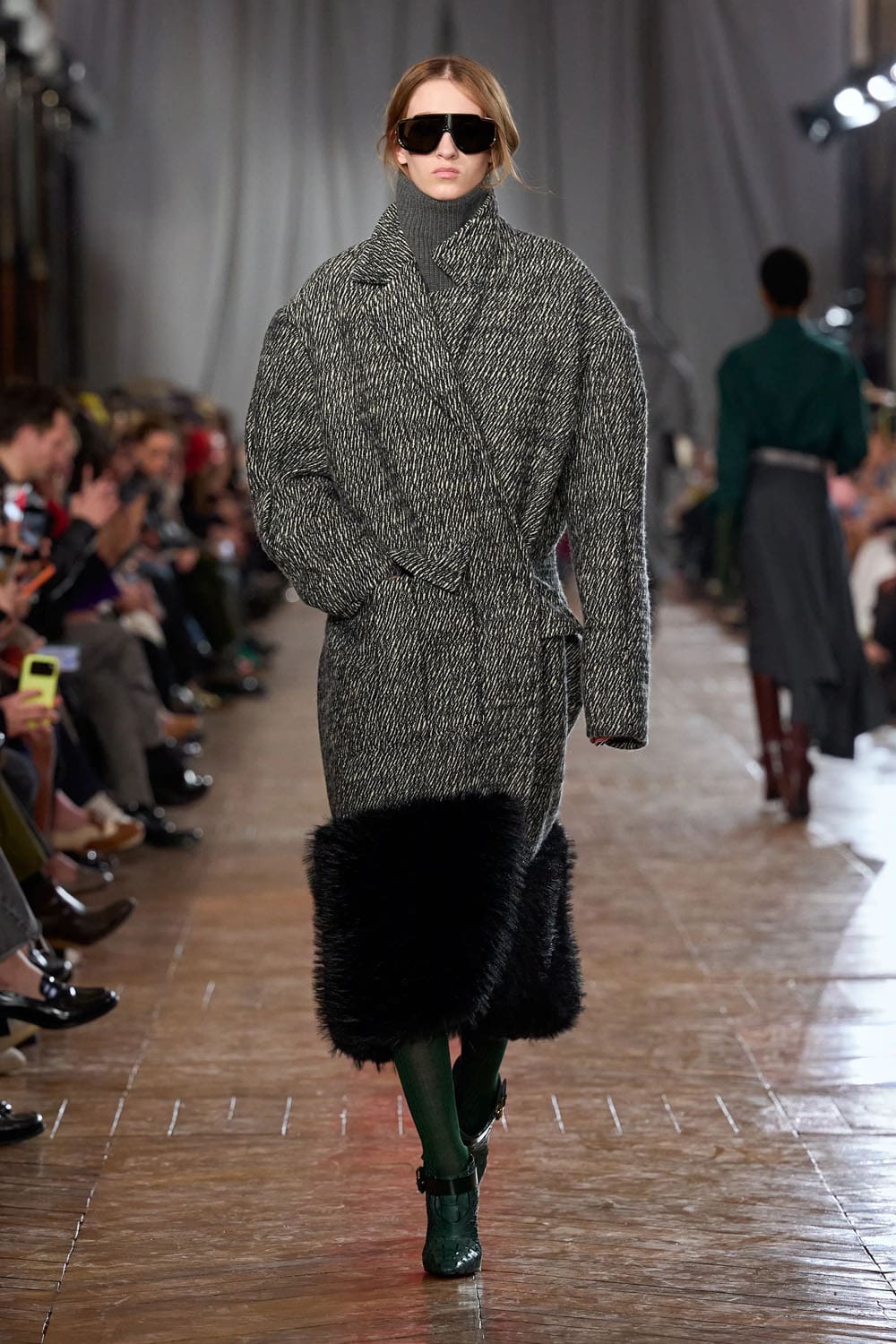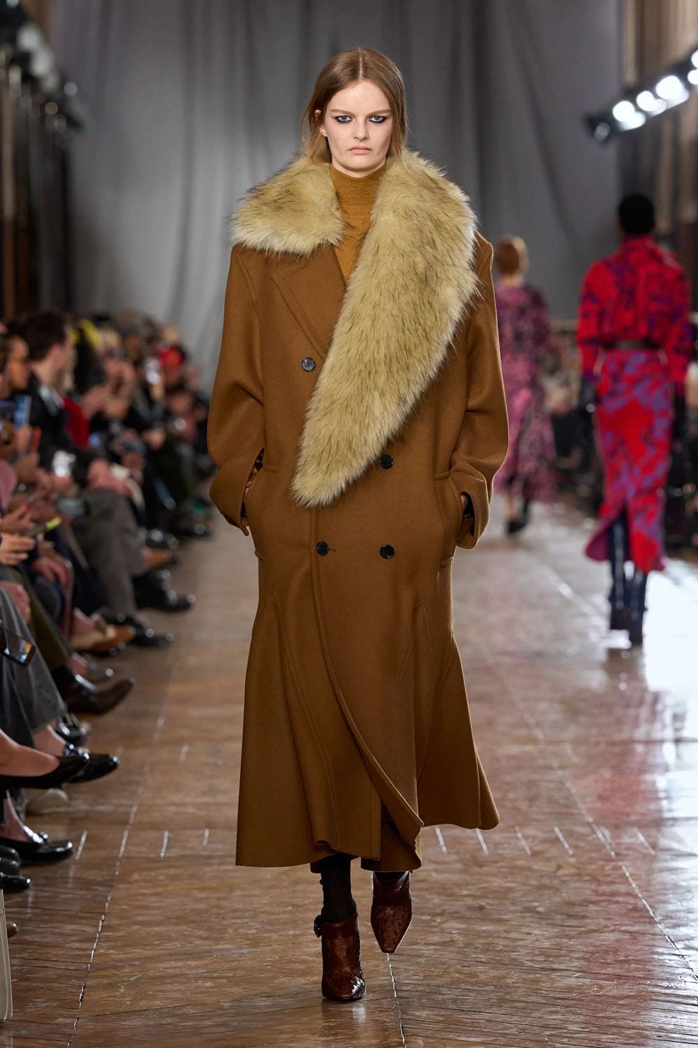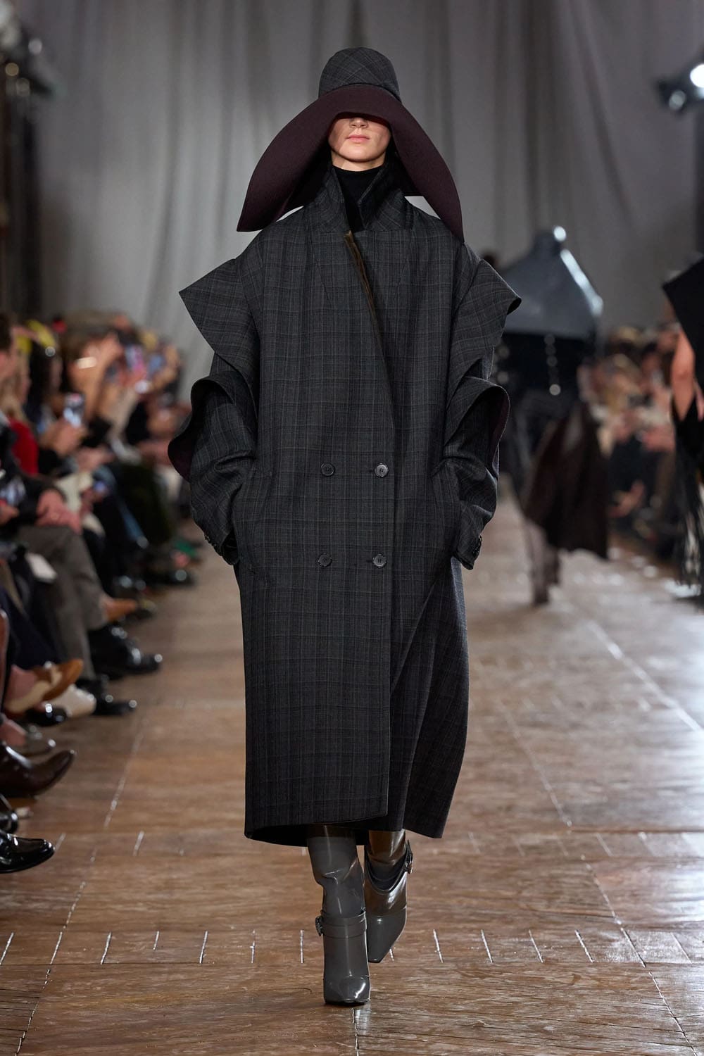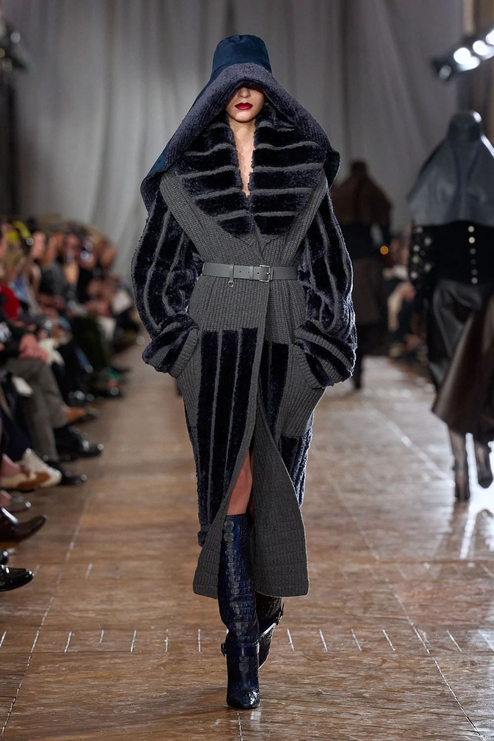 Les manteaux répondaient directement à l'architecture de la galerie — la lumière frappant la laine comme elle frappe les facettes minérales, révélant structure, poids et raffinement.
