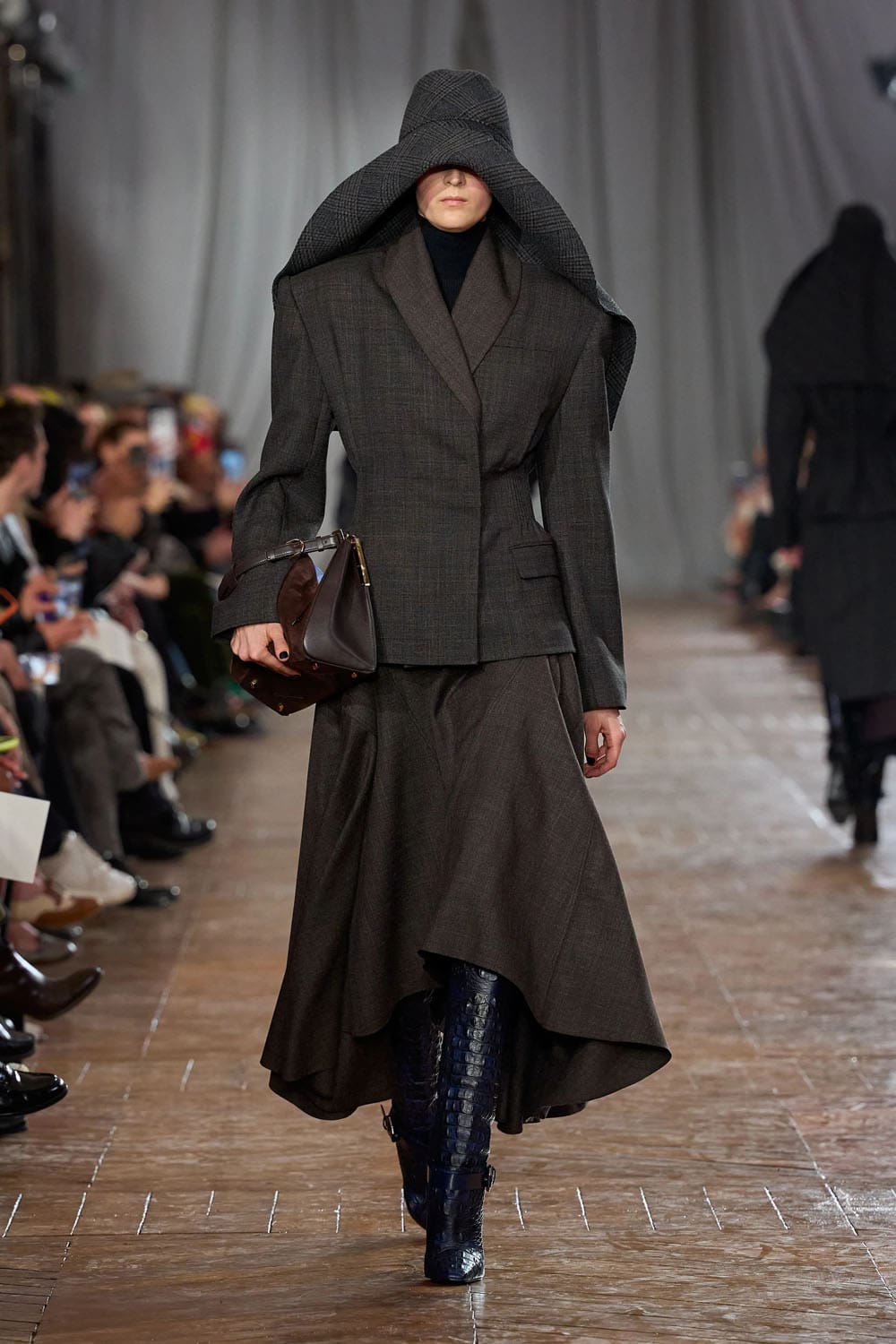 La collection s'ouvrait sur des pièces de tailleur sculptées, l'instrument de prédilection de Copping pour exprimer l'autorité sans agressivité. Un tailleur en laine anthracite, ajusté au corps et évasé en une jupe évasée, rappelait la précision de Jeanne Lanvin. robes de stylemais dépouillée de tout ornement et repensée pour une allure contemporaine. Une autre, d'un bleu nuit profond, aux épaules légèrement arrondies et à la taille discrètement cintrée, suggérait une femme qui évolue dans son monde avec douceur et maîtrise.