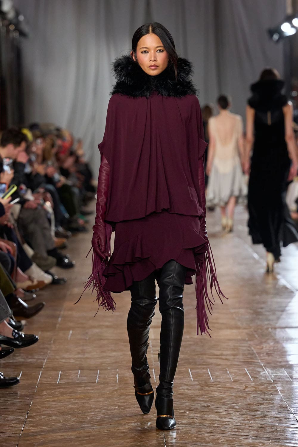Le stylisme mettait l'accent sur le mouvement : les robes flottaient au vent à chaque pas ; les manteaux s'ouvraient au rythme parfait. Tout semblait chorégraphié pour la nuit parisienne : élégant, maîtrisé, avec une pointe d'impatience.