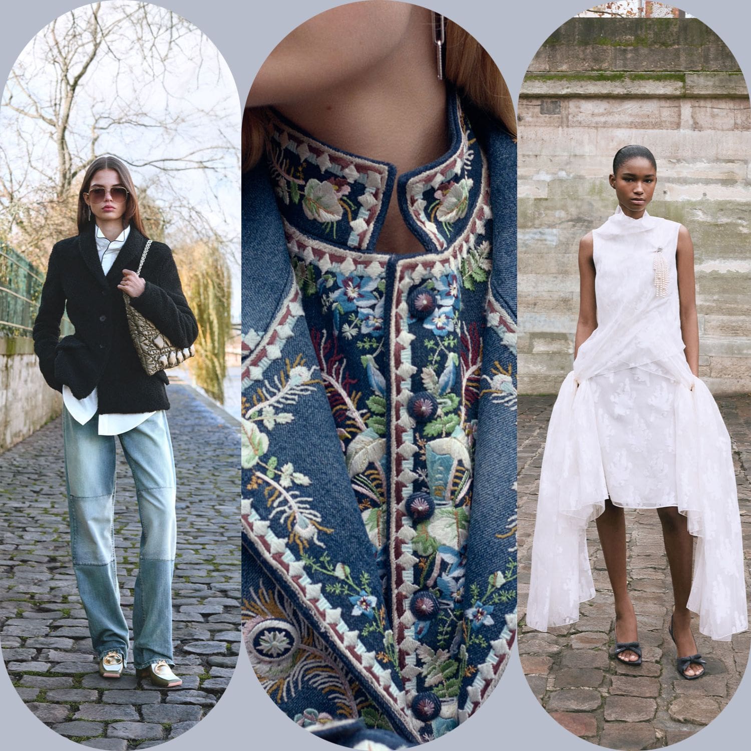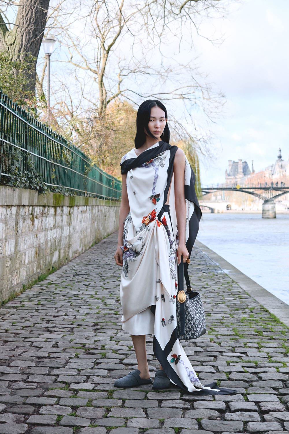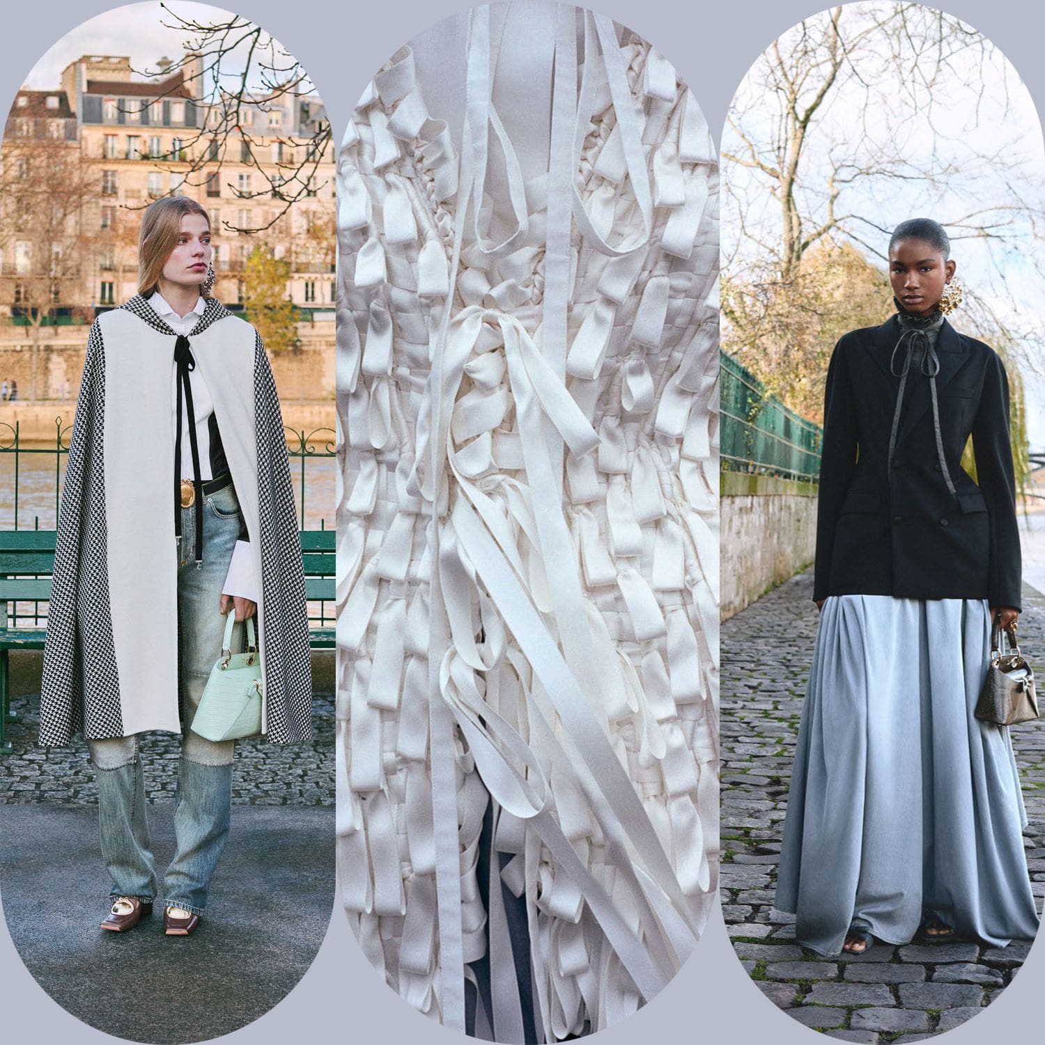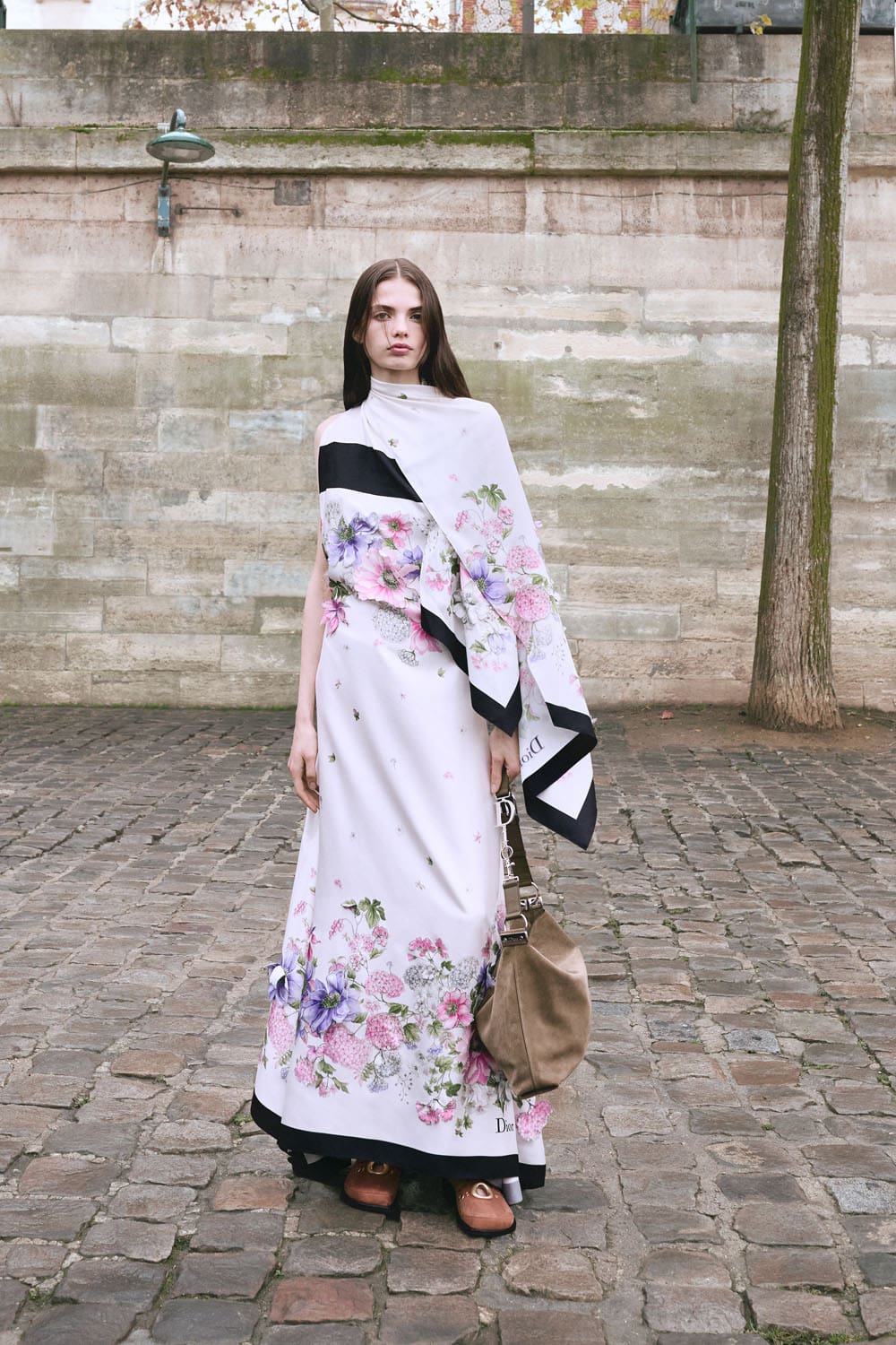 La collection s'articule autour de la notion de transformation – non pas de soi en quelqu'un d'autre, mais de la garde-robe en un ensemble de possibilités. Les pantalons larges en denim de soie et les robes sculpturales ne sont pas des opposés ; ils représentent les points d'un spectre d'attitudes, permettant à celle qui les porte de passer à volonté d'une posture contemplative à une allure théâtrale. Les accessoires, eux aussi, sont utilisés avec intention : le sac Lady Dior côtoie les nouveaux sacs Dior Cigale et Crunchy, suggérant non pas une hiérarchie, mais une pluralité – la liberté de définir son histoire à travers ses vêtements.