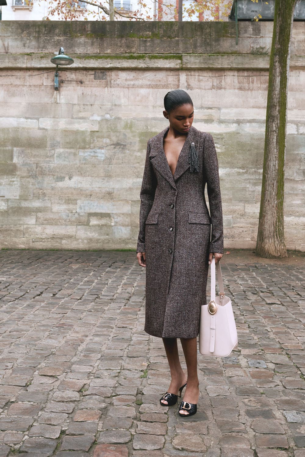 Chaque pièce – qu’il s’agisse de l’emblématique veste Bar, revisitée en blazer court et souple ou transformée en un manteau ample, ou d’une robe drapée saisie en plein mouvement – s’inscrit dans ce dialogue permanent entre tradition et modernité. Une retenue affirmée se dégage : une discipline chromatique dans des palettes discrètes, la patience d’un couturier dans chaque couture et chaque pli, le caractère subtilement théâtral d’une cape réalisée en maille plutôt qu’en velours.